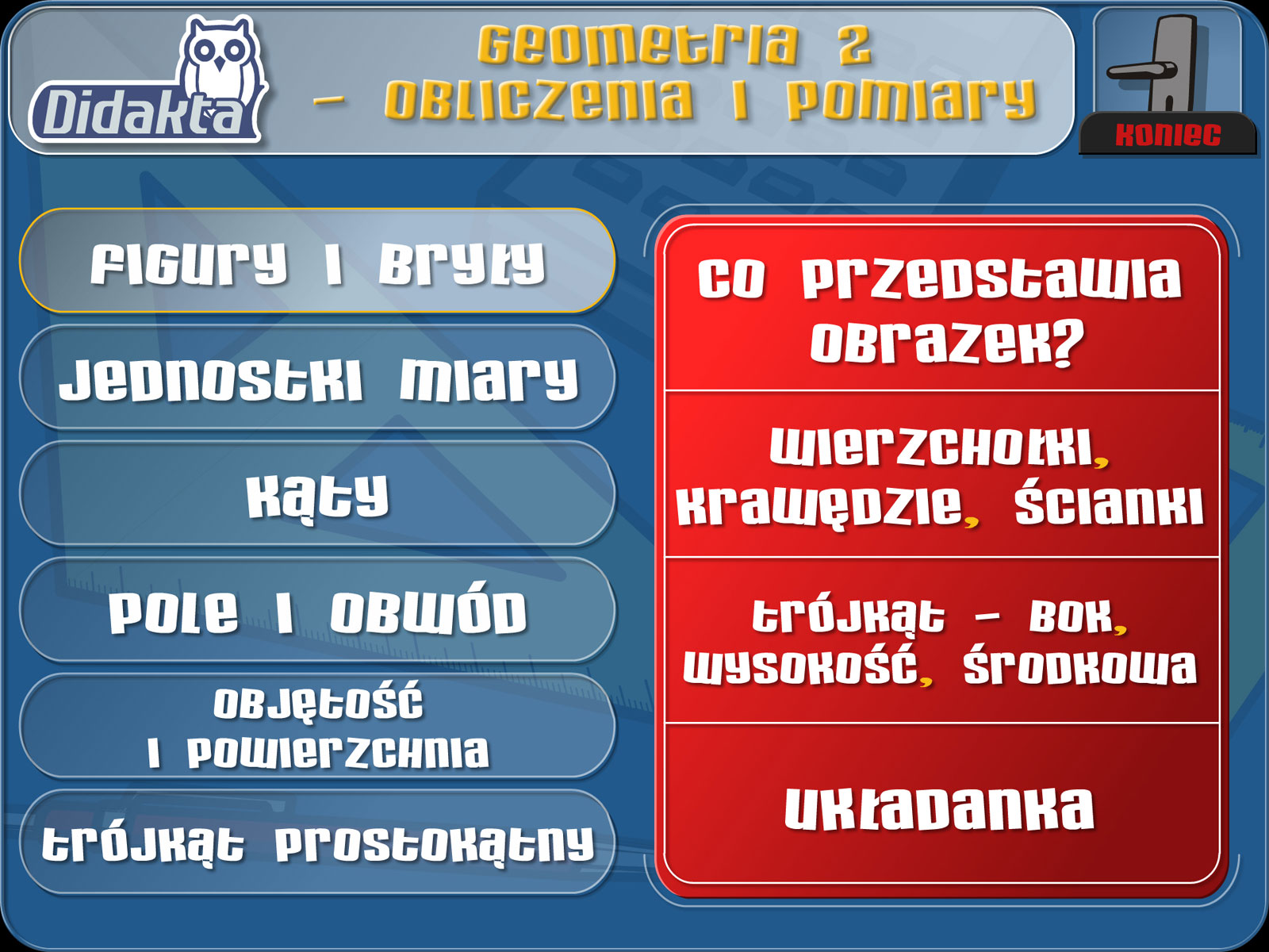 Program Didakta – Geometria (Obliczenia i pomiary) obejmuje zadania z geometrii i orientacji przestrzennej. Wykonując ćwiczenia interaktywne wymagające obliczeń, dzieci mają dostęp do przyborów takich, jak: kalkulator, miarka do określania długości, kątomierz czy kartki w kratkę na obliczenia pomocnicze.