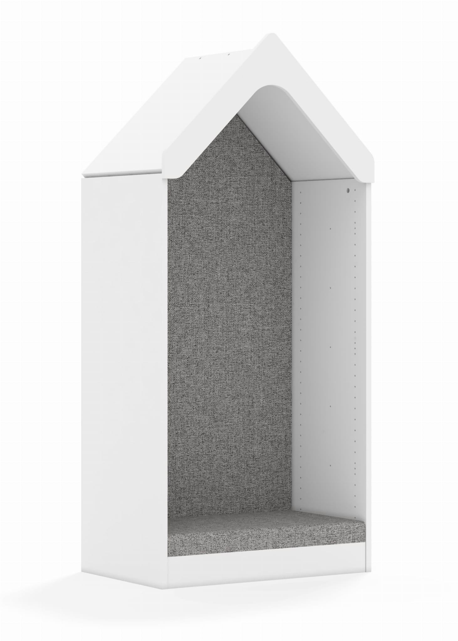Kolekcja mebli Blox Base to wszechstronne i eleganckie rozwiązanie do każdego wnętrza. Fronty szafek i szuflad można wybierać spośród trzech kolorów: biały, szary, dąb kamienny, co pozwala na ich dowolne miksowanie i tworzenie unikalnych kompozycji kolorystycznych. Kolekcja Blox Base łączy funkcjonalność z nowoczesnym designem, oferując elastyczność w aranżacji przestrzeni i doskonałe dopasowanie do indywidualnych gustów użytkowników. Domek tapicerowany o wymiarach 706x466x1575 mm z korpusem wykonanym z płyty melaminowanej o grubości 18 mm, dostępny w kolorach: biały, szary, dąb kamienny. Plecy mebla z płyty meblowej stabilizujące mebel, umożliwiając jego bezpieczne użytkowanie jako siedziska. Montaż elementu odbywa się według prostego systemu RAFIX, czyli "wepnij element i zatrzaśnij". Miękkie, tapicerowane siedzisko wraz z oparciem zapewniające komfort podczas siedzenia. Wypełnienie siedziska wykonane z usztywnionej pianki poliuretanowej odpornej na wgniecenia o gęstości 40 kg/m3. Pianka o grubości 50 mm obłożona tkaniną posiadającą certyfikat trudnopalności, wykonaną z poliestru 100% o gramaturze 370 g/m² i ścieralności 80 000 cykli lub tkaniną wykonaną z PCW 100% o gramaturze 550g/m² i ścieralności 30 000 cykli. Dostępna w 18 różnych kolorach, co pozwala na łatwe dopasowanie do każdego wnętrza. Cokół w kolorze korpusu chroniący dolne krawędzie mebla przed uszkodzeniami i zabrudzeniami. Daszek stanowi atrakcyjny dodatek do linii mebli BLOX. Korona daszka wykonana z solidnej płyty MDF o grubości 16 mm, malowana i lakierowana farbą posiadającą atest Polskiego Towarzystwa Alergologicznego (PTA). Przód i boki daszku w kolorze białym, tył w kolorze korpusu. Cała powierzchnia daszka posiada zaokrąglone krawędzie, uzyskane dzięki precyzyjnemu wycinaniu na ploterze frezującym, co zwiększa bezpieczeństwo użytkowania. Element przymocowany do korpusu mebla za pomocą elementów pośredniczących. Domek zapewnia wygodne miejsce do siedzenia i wyjątkowego charakteru.