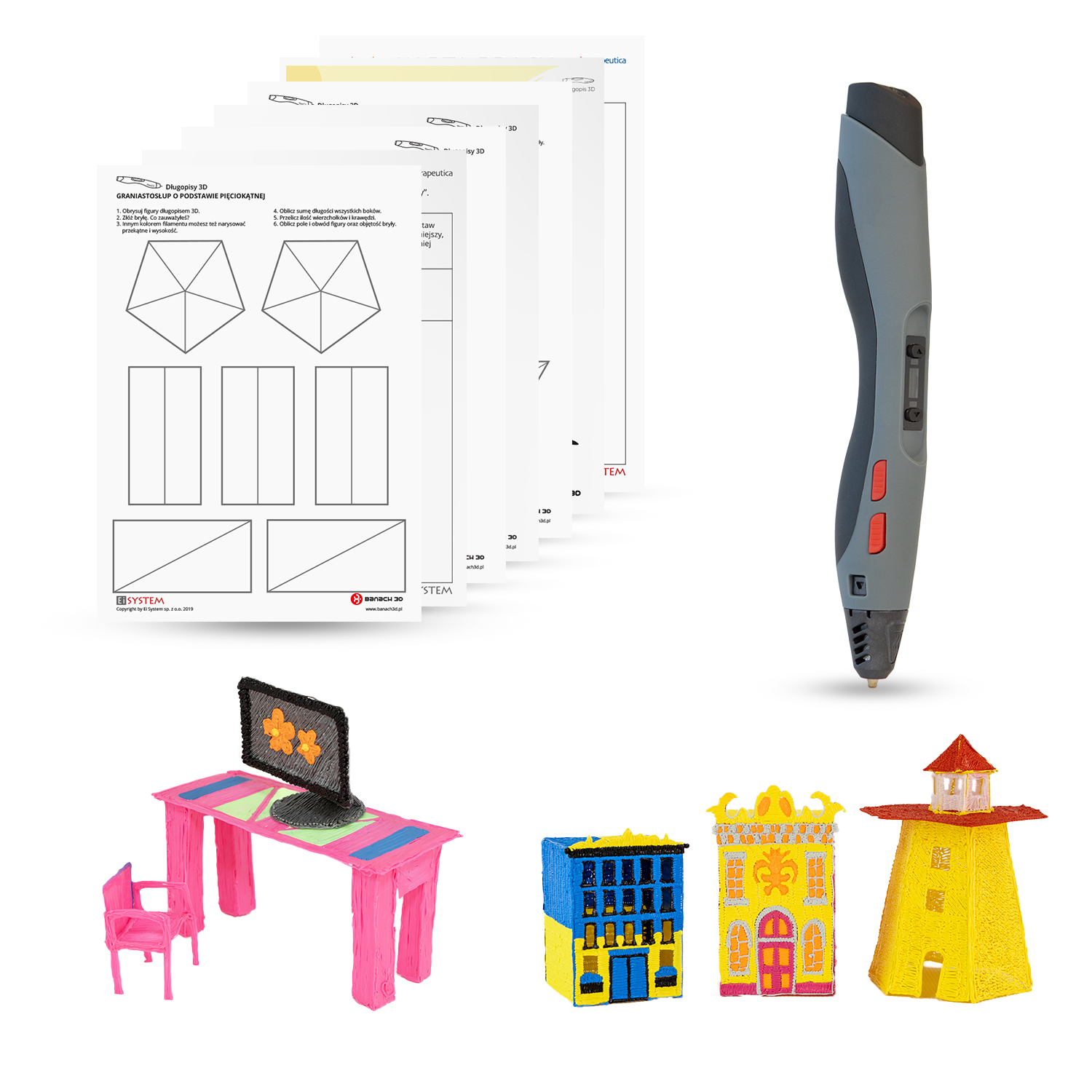 - długopis Banach 3D z kartami pracy oraz materiałem do tworzenia modeli.