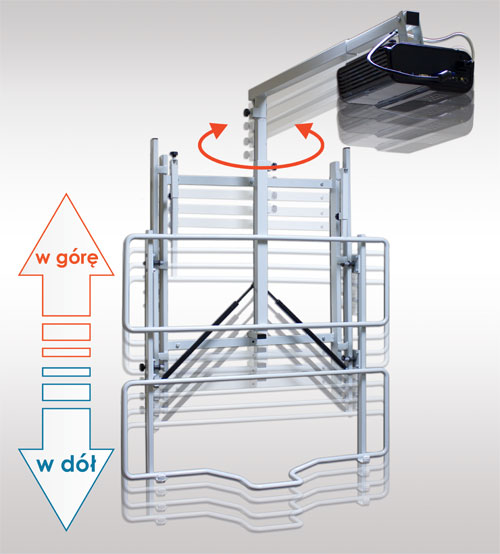 Ramię do projektora obraca się o 90º wokół punktu osadzenia - co pozwala na precyzyjne ustawienie oka soczewki względem tablicy. Dodatkową zaletą jest też możliwość złożenia wysięgnika z projektorem do boku tablicy.